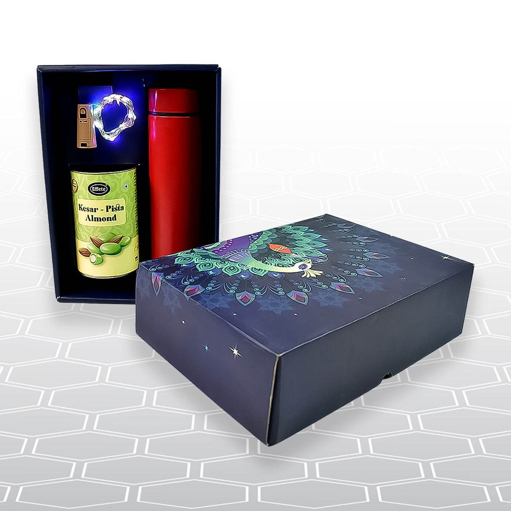 Personalized Temperature Water Bottle, 2in1 Keychain & Kesar-Pista Almond Chocolate (With Attractive Peacock Box / 3 Pc Set / Mix Color Bottle)
