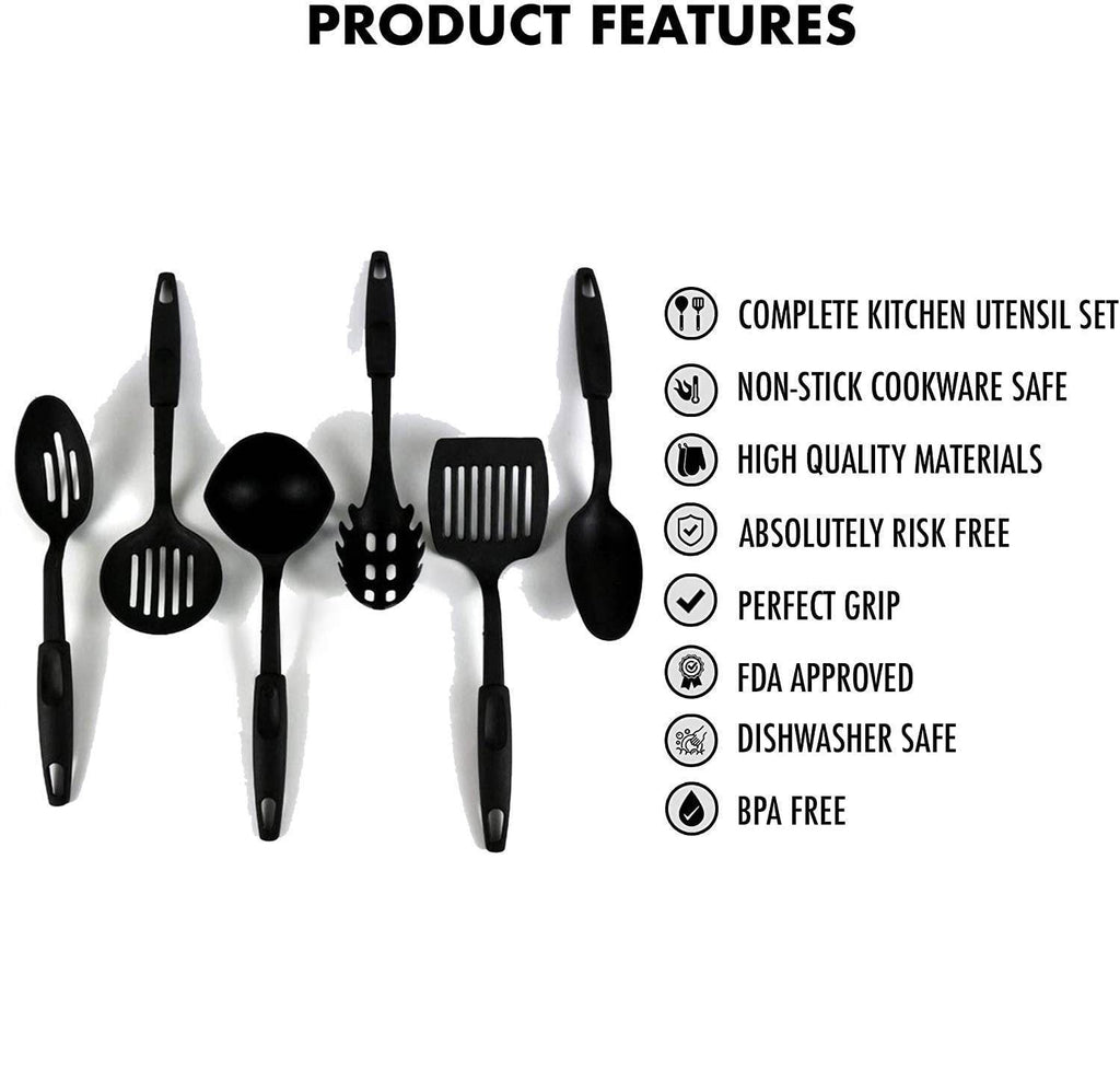 Nylon Heat-Resistant Nonstick Spoon Spatula Turner Scoop Kitchen Cooking Utensil Tools Set (6pcs, Black)